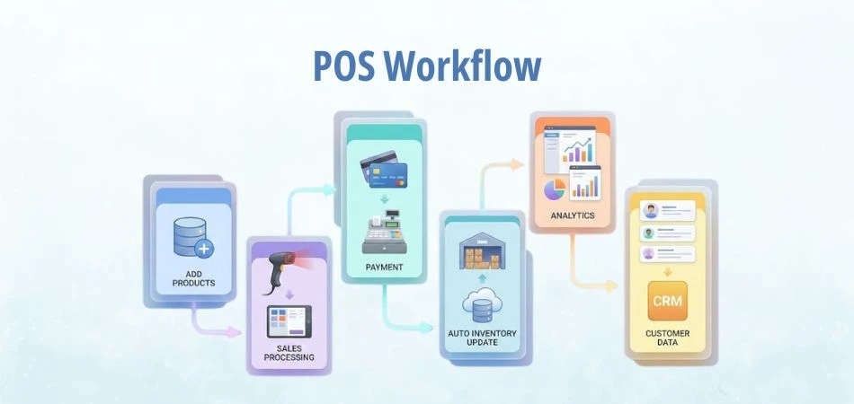 Modern POS (Point of Sale) software integrates sales, payments, inventory, and customer management into one streamlined system. Below is an overview of how it functions: