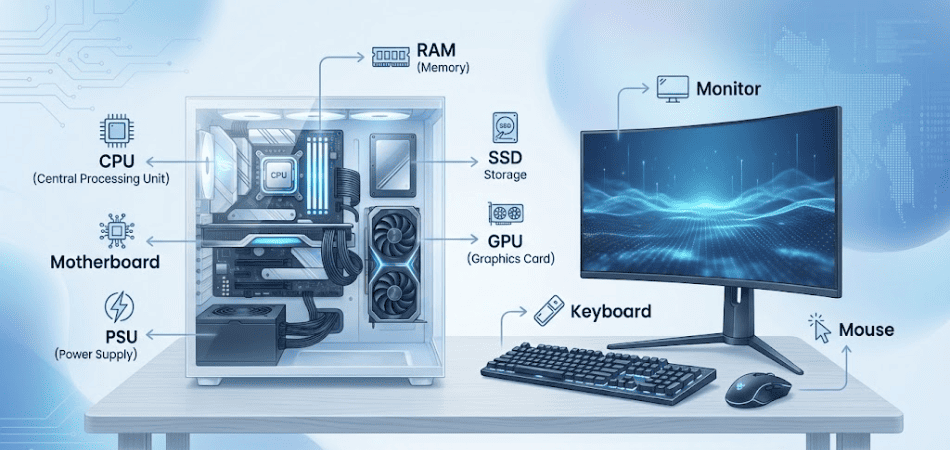 A desktop PC is a personal computer designed to be used in a fixed place, such as a desk or workstation. Unlike laptops, desktops consist of separate components, making them easy to upgrade or replace when needed. Though not portable, they deliver superior performance and customization, which is why many users prefer them.