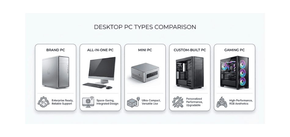 These are fully assembled systems made by manufacturers such as HP, Dell, Lenovo, Asus, Acer, MSI, and Apple. They are ideal for those who want a ready-to-use, hassle-free solution with official warranty and after-sales service. However, their upgrade flexibility is more limited compared to custom-built PCs.
